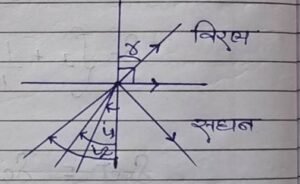 → जब प्रकाश की किरण किसी सघन माध्यम से विरल माध्यम में जाती है, तो आपतित किरण लम्ब से अधिक कोण पर जाती है। यदि आपतन कोण को बढ़ाते जाते हैं, तो एक निश्चित आपतन कोण पर आपतित किरण का अपवर्तित किरण माध्यम की सतह के समानान्तर हो जाती है। इस कोण को क्रांतिक कोण कहते हैं।